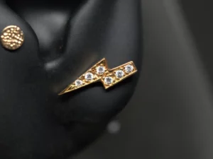 14k gold “lightning”Thurisaz” stud set with white CZ, pressure fitted – 14g/16/ screw available